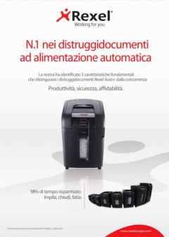 MACCHINE PER UFFICIO N.1 nei distruggidocumenti ad alimentazione automatica La ricerca ha identificato 3 carattteristiche fondamentali che distinguono i distruggidocumenti Rexel Auto+ dalla concorrenza Produttività, sicurezza, affidabilità. 98% di tempo risparmiato sparmiato Primo soccorso - valigette ed armadietti hiudi, fafaf tto Impila, chiudi, fatto Fonte risultati dei test su Auto Feed 500X: Intertek - luglio 2014 571 www.rexeleurope.com