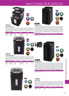 MACCHINE PER UFFICIO 300 60L 16L 300 40L 16L AUTO MAX 300C AUTO+ 300X & 300M DIstruggidocumenti ad alimentazione automatica per uffi ci con uso condiviso grazie alla chiusura di sicurezza Blocco Intelligente™ che si attiva automaticamente ad ogni ciclo di distruzione, Con Auto+ 300 non occorre stare in piedi per inserire i fogli né rimuovere punti metallici o graffette. proteggendo le informazioni sensibili. Grazie alla tecnologia Fellowes SureFeed la distruzione ® Dispone di un`alimentazione automatica e di un cestino da 40 litri che consentono di caricare fi no avviene a mani libere, caricando il cassetto fi no a 300 fogli e premendo il tasto di avvio. Il Sistema a 300 fogli A4. Disponibile sia in versione con taglio a frammento 4x45mm e livello dsicurezza p-4 JamGuard ™ previene l’interruzione della distruzione evitando gli inceppamenti. Può distruggere (modello AUTO+ 300X), che nella versione con taglio micro di 2x15 mm, livello di sicurezza P-5 anche CD, carte di credito, carta spiegazzata o piegata, carta stampata a colori su entrambi i lati, (modello AUTO+ 300M). documenti con graffette o punti metallici fi no a 20 fogli. Cestino estraibile da 60 litri e ciclo di Cod. Rif.Art. Capacità Modello Cestino Umv lavoro di 30 minuti. 65297 2103250EU 300fg Auto+300X 40lt pz Cod. Rif.Art. Capacità Cestino Umv 72003 2104300EU 300fg Auto+300M 40lt pz 74782 4651601 300fg 60lt pz 500 80L 16L 500 75L 16L AUTO+ 500X & 500M Con Auto+ 500 non occorre stare in piedi per inserire i fogli né rimuovere punti metallici o graffette. Dispone di un`alimentazione automatica e di un cestino da 80 litri che consentono di caricare fi no a 500 fogli A4. Disponibile sia in versione con taglio a frammento 4x45mm e livello dsicurezza p-4 (modello AUTO+ 500X), che nella versione con taglio micro di 2x15 mm, livello di sicurezza P-5 (modello AUTO+ 500M). Cod. Rif.Art. Capacità Modello Cestino Umv AUTO MAX 500C 66687 2103500EU 500fg Auto+500X 80lt pz DIstruggidocumenti ad alimentazione automatica per uffi ci con uso condiviso grazie alla chiusura 72004 2104500EU 500fg Auto+500M 80lt pz di sicurezza Blocco Intelligente™ che si attiva automaticamente ad ogni ciclo di distruzione, ® proteggendo le informazioni sensibili. Grazie alla tecnologia Fellowes SureFeed la distruzione avviene a mani libere, caricando il cassetto fi no a 500 fogli e premendo il tasto di avvio. Il Sistema JamGuard ™ previene l’interruzione della distruzione evitando gli inceppamenti. Può distruggere anche CD, carte di credito, carta spiegazzata o piegata, carta stampata a colori su entrambi i lati, documenti con graffette o punti metallici fi no a 20 fogli. Possibilità di programmare l’avvio ritardato della distruzione dopo 30, 60 o 90 minuti. Cestino estraibile da 75 litri e ciclo di lavoro continuo. Distruggidocumeti automatici Cod. Rif.Art. Capacità Cestino Umv 74783 4652101 500fg 75lt pz AUTO+ 750X 750 27L Con Auto+ 750 non occorre stare in piedi per inserire i fogli né rimuovere punti metallici o graffette. Basta caricare fi no a un massimo di 750 fogli di carta di formato A4 alla volta, bloccare la macchina mediante un codice PIN e lasciare che il distruggidocumenti Auto+ 750 faccia il suo dovere.. 16L Disponibile sia in versione con taglio a frammento 4x45mm e livello di sicurezza p-4 (modello AUTO+ 750X), che nella versione con taglio micro di 2x15 mm, livello di sicurezza P-5 (modello AUTO+ 750M). Cestino da 115L. Cod. Rif.Art. Capacità Cestino Umv 68652 2103750 750fg 27lt pz 573